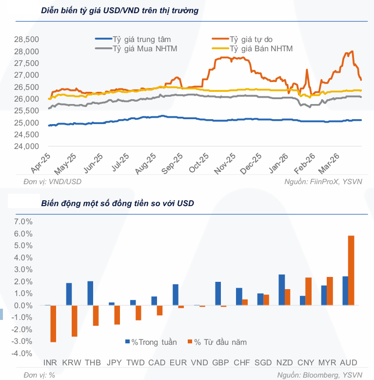 Trong khi đó, nhận định về sức mạnh đồng USD, Chứng khoán Yuanta Việt Nam lại cho rằng, động lực chính đến từ việc tâm lý rủi ro toàn cầu cải thiện sau thông tin về thỏa thuận ngừng bắn tạm thời tại Trung Đông khiến nhu cầu trú ẩn vào USD suy giảm, bất chấp tín hiệu từ biên bản họp của Cục Dự trữ Liên bang Mỹ (Fed) tháng 3/2026 cho thấy Fed ngày càng lo ngại rủi ro lạm phát quay trở lại và thị trường đang kỳ vọng Fed sẽ không có lần giảm lãi suất nào trong năm 2026.
