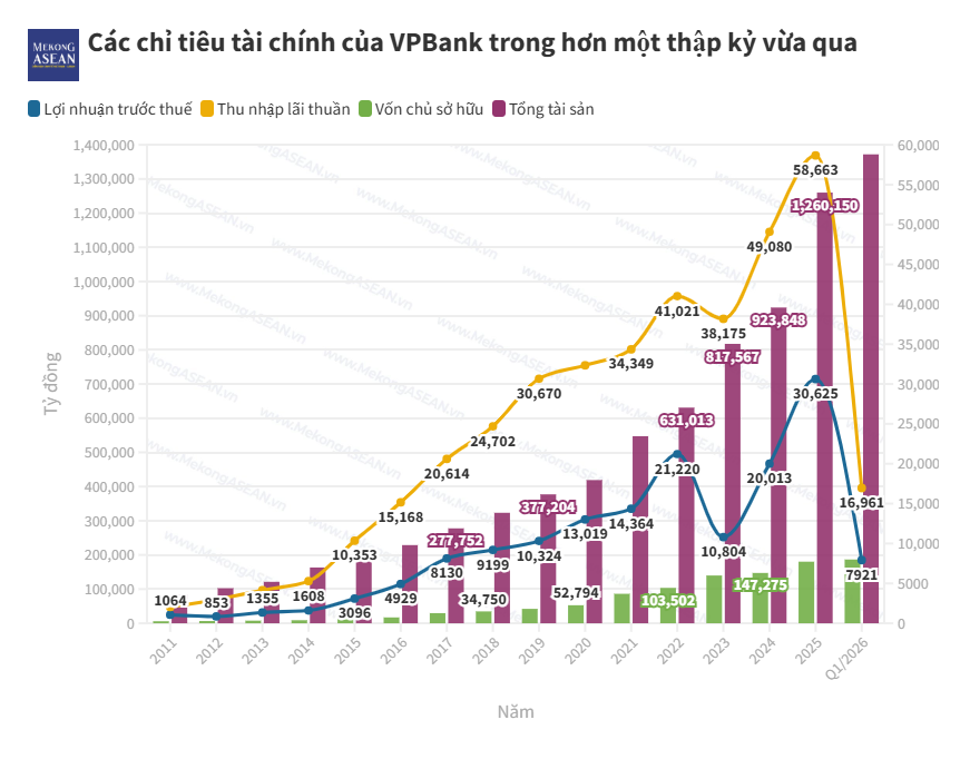 Với dư nợ hợp nhất đạt 1,06 triệu tỷ đồng và tăng hơn 10% so với cuối năm trước, VPBank mở rộng đáng kể quy mô ngay trong quý đầu năm 2026. Lợi nhuận trước thuế tăng 58% so với cùng kỳ, trong khi các công ty thành viên như VPBankS, OPES và GPBank đồng loạt đóng góp tích cực.